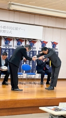 市長からのご挨拶においては、小郡市陸上競技場でのラグビー公式戦の開催への期待など、